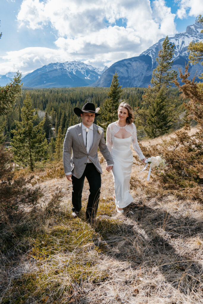 Elopements typically keep florals simple — a bouquet and boutonnière are often all you need. Mountain Top Flowers in Banff is a popular choice for their mountain-friendly arrangements.